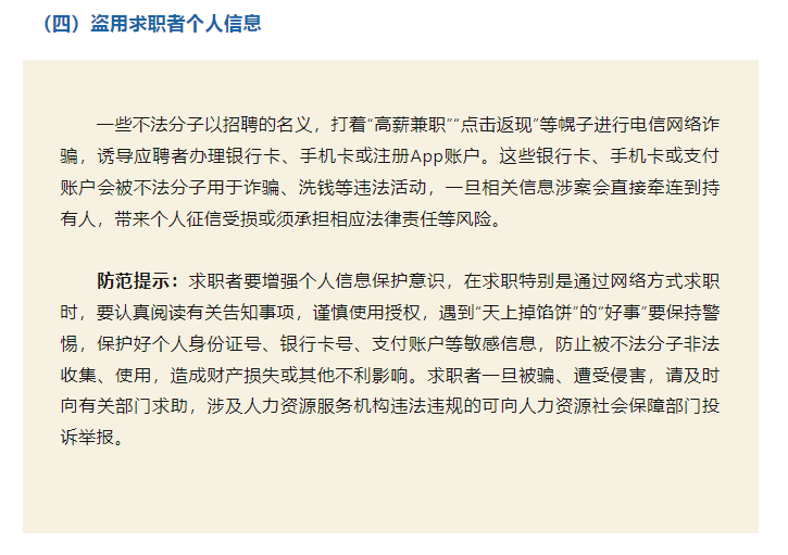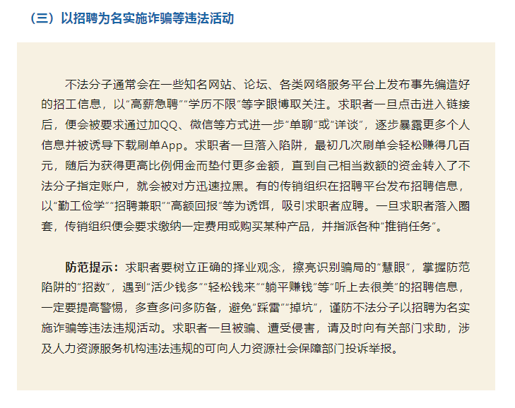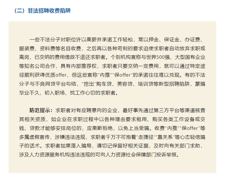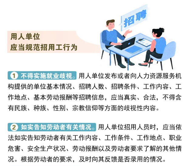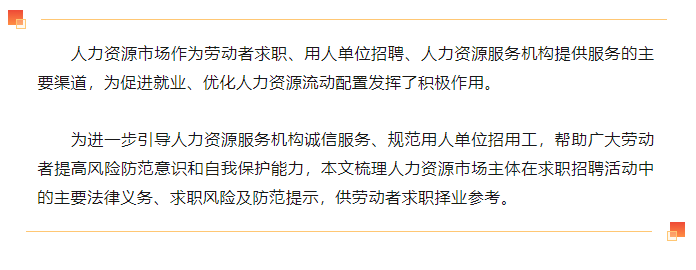 為進一步引導(dǎo)人力資源服務(wù)機構(gòu)誠信服務(wù)、規(guī)范用人單位招用工,幫助廣大勞動者提高風(fēng)險防范意識和自我保護能力,本文梳理人力資源市場主體在求職招聘活動中的主要法律義務(wù)、求職風(fēng)險及防范提示,供勞動者求職擇業(yè)參考。