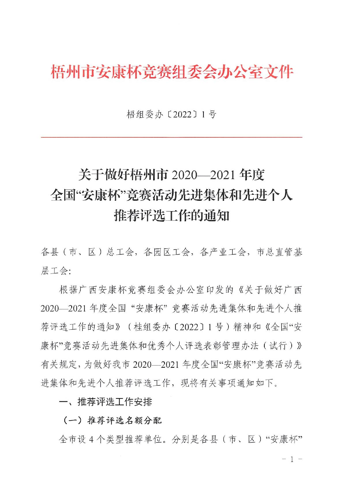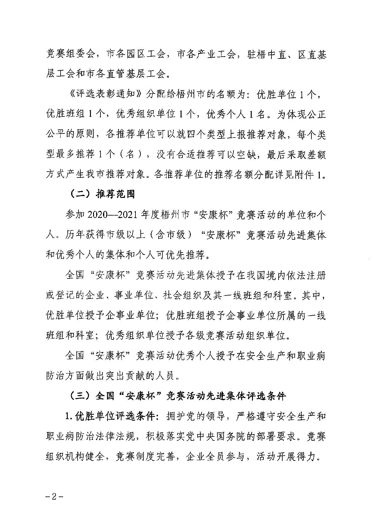 關(guān)于做好梧州市2020—2021年度全國(guó)安康杯競(jìng)賽活動(dòng)先進(jìn)集體和先進(jìn)個(gè)人推薦評(píng)選工作的通知